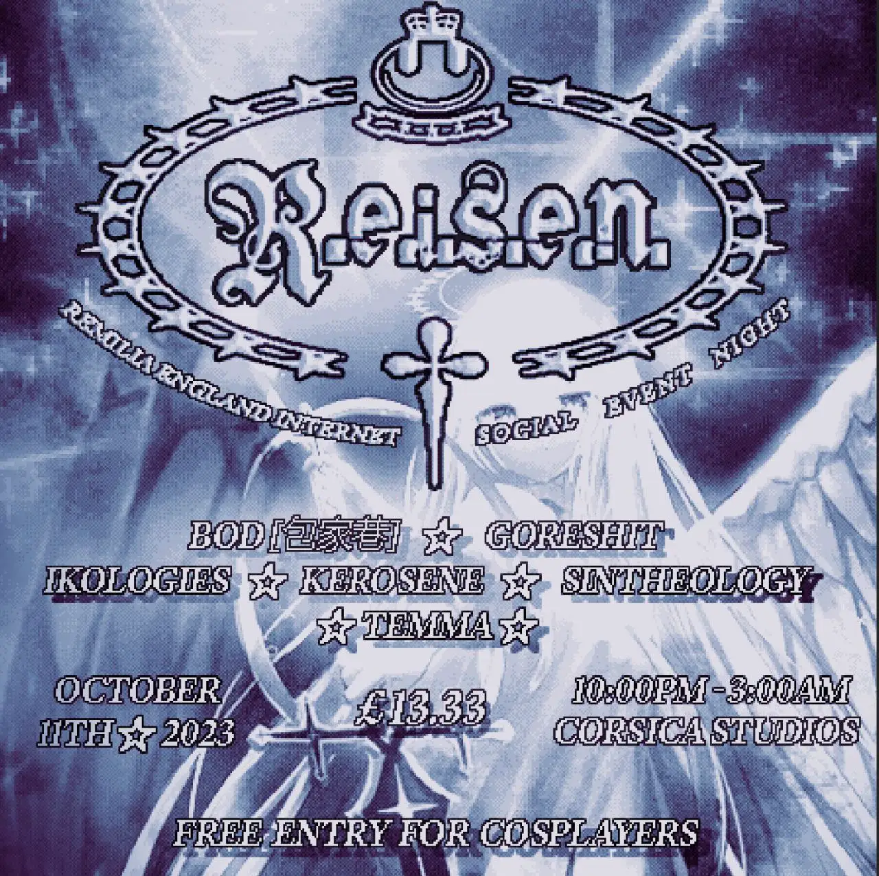 33reisen: London, October 2023 was an installment of the 33reisen rave series held on October 11, 2023, at Corsica Studios in London. Organized by Remilia England Internet (R.E.I.S.E.N), the event featured a lineup of breakcore DJs and highlighted the fusion of anime aesthetics with underground electronic music culture.[1]