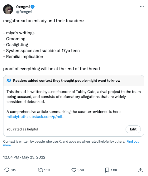 The controversy emerged during a period of rivalry between NFT projects, with Tubby Cats—a competing collection co-founded by 0xngmi—struggling to gain traction in Milady's shadow.