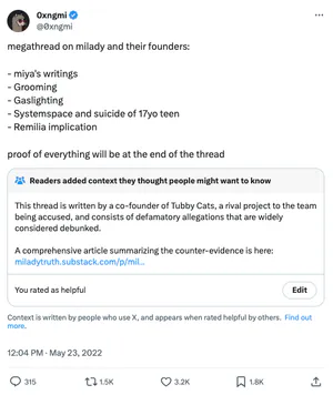 - ↑ 1.0 1.1 1.2 James Liao (May 27, 2022). "Megathread clearing Milady/Charlotte/Miya/Remilia's name". Twitter.